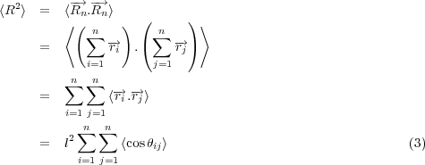 Here we consider ideal chains, that like ideal gases, feature no net interaction (repulsive or attractive) among the n monomers, each with bond length l. We start with a description of the end to end distance of the chain. Given the random nature of displacements of monomers with respect to each other, the mean end-end distance, < R >= 0. The first non-trivial moment of the distribution of end-end distances is the second moment, so we look at the mean squared end-end distance, < R2 >, defined in Equation 3.
