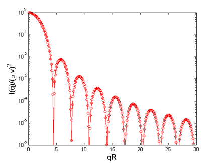 For a thin circular disk, the scattered intensity is given in Equation 10 where J1 is the first order Bessel function.